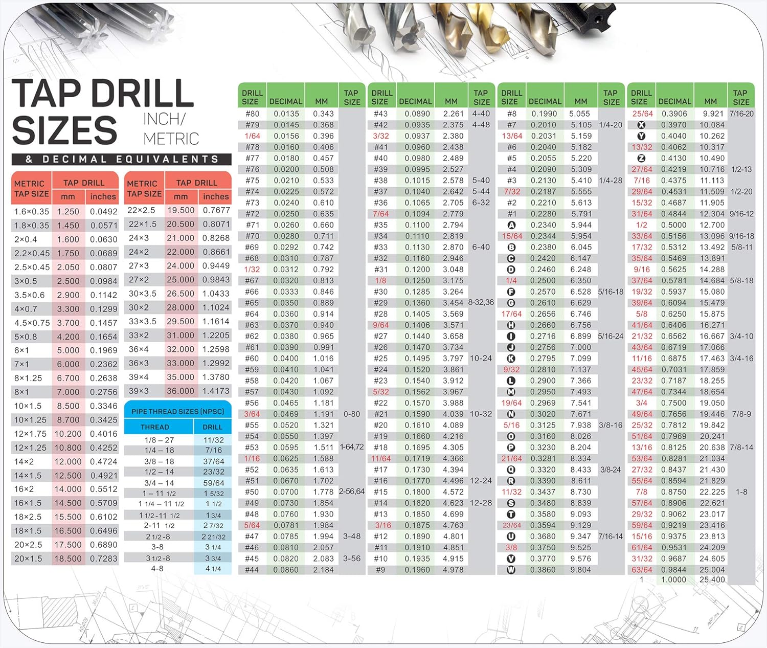 Recommended tap drill sizes for approximately 75% depth of thread click the following link for a drill sizes for special tap sizes. Our tap and clearance drill charts are available as an adobe acrobat pdf file. M, mf, mj, unc, unjc, unf, unjf, pg, tr, g, bsw, unef, un, npt, bsf, rp, ba, rc, eg m, eg unc, eg unf. A good way to decide on what diameter drill to choose is to use a tap drill reference chart like the examples below. This chart is for common british size threads, bsw, bsf, bsp and bstp. Decimal equivalents and tap sizes of fraction, number, letter and metric sizes. Drill sizes given are the 'closest' drill size. Use thread check's tap drill chart to determine the right size tap drill you need. Contact us for additional information on special tap drill sizes. To calculate tapping drill size for metric threads subtract the pitch from the major diameter, select the next larger standard drill size. All standard size taps come with at least one drill bit size that corresponds to it. Also we will find there tap drill in metric and imperial sizes for wire insert taps and thread forming taps. 3.4 out of 5 stars 37.